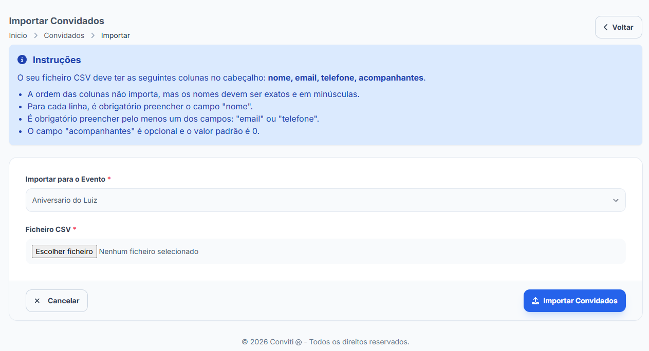 Clique no botão "Importar Convidados" para processar os dados.