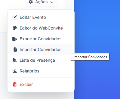 Localize o evento desejado, clique em "Ações" e selecione "Importar Convidados".