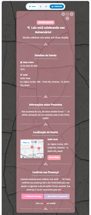Lado direito: visualização do seu convite em tempo real e publicação