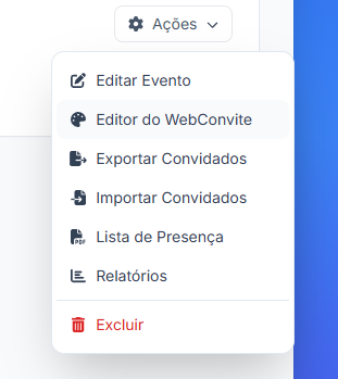 No menu "Meus Eventos", localize o evento desejado, clique em "Ações" e selecione "Editor do Convite" ou diretamente no menu principal "Convites Online".