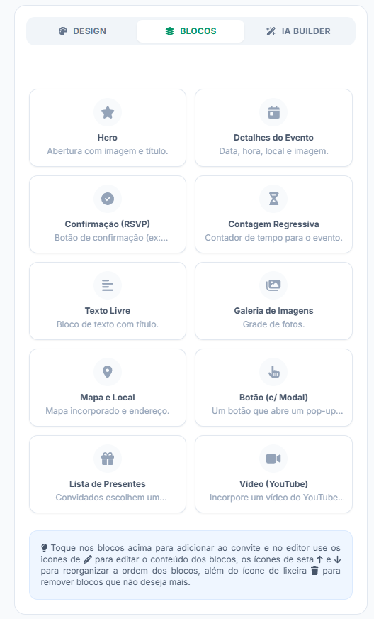 💡 Você pode reorganizar, editar ou remover os blocos facilmente, para isso basta clicar ou passar o mouse sobre o bloco qual deseja editar/remover que vai exibir as opções, ao editar vai exibir as configurações individuais de cada um dos blocos adicionados ao seu convite.